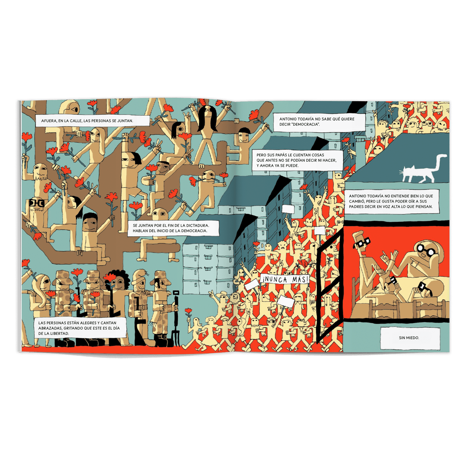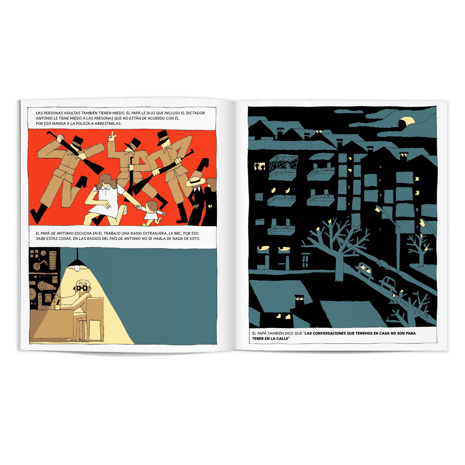 Cuando Antonio nació, su país vivía en una dictadura. Cuando sus papás nacieron, también. En su casa nunca nadie supo qué es vivir sin dictadura. El dictador dicta órdenes que todos obedecen, por más que sean estúpidas, peligrosas o injustas; por más que provoquen sufrimiento o estén fuera de la ley. El miedo está por todos lados (hasta en los pensamientos) y el mismo miedo da miedo. Pero, un día, todo cambia, y el tiempo de los dictadores finalmente se termina. Es en ese momento que empieza la historia de una de las palabras más hermosas: LIBERTAD.